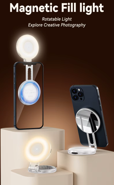 Além de iluminar, ela se transforma em um suporte estável para o celular. Um acessório 2 em 1 que combina conveniência e estilo no seu dia a dia.